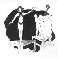 One of the most practical illusion accessories you could own. It has a variety of uses and is simple to construct and perform. One effect would be that the small two-fold screen is set up on stage. You can see through the frame as the magician passes behind it, setting it up and putting its top on. A cloth is shown and held up as in our illustration and, when dropped, there stands your assistant! Or, you can honor its name and do the reverse to make your assistant disappear. Many effects can be accomplished with this prop. Stack tires on the frame and make your assistant appear or disappear within them. You can do an exchange by turning a male assistant into a female, or turn a child into a bunny. Many effects are possible with this small two-fold frame.